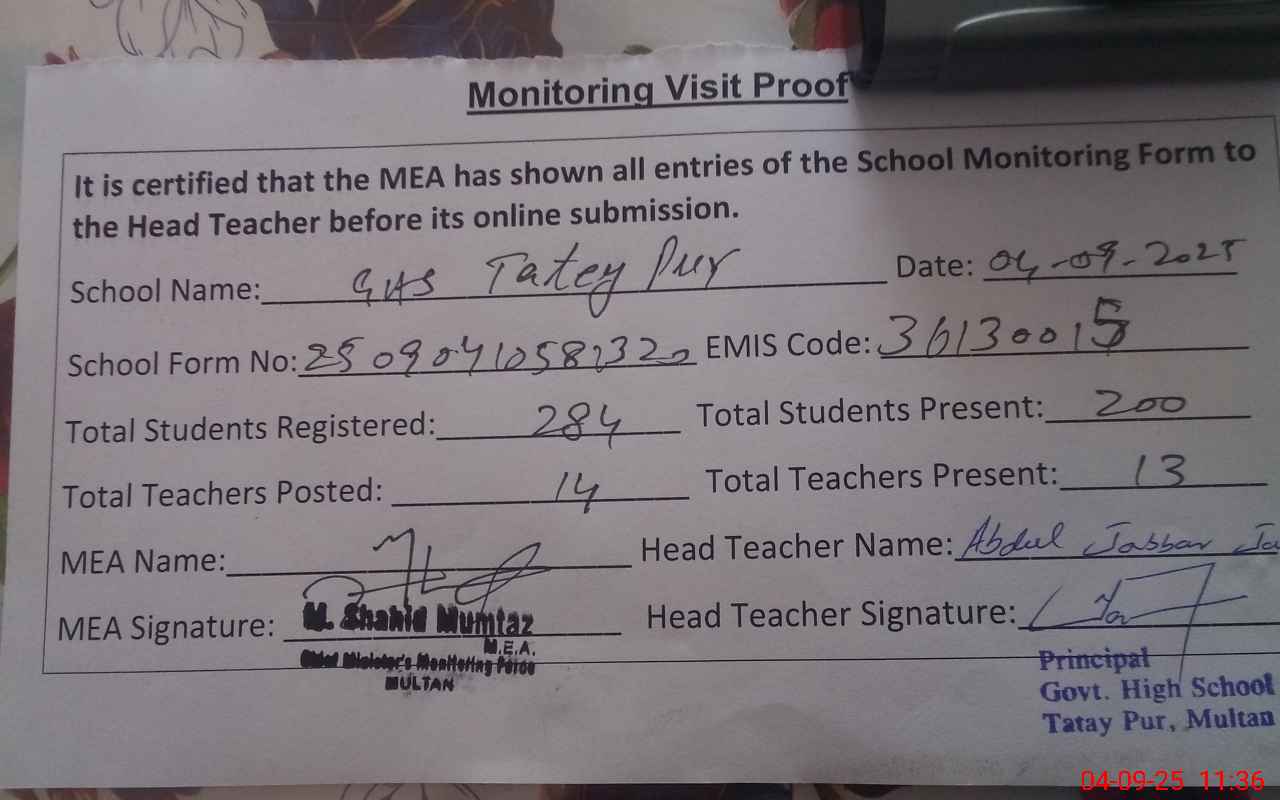 | EMIS Code: 36130015 | Name of School: GHS TATEY PUR MULTAN MAUZA TATEY PUR | |||