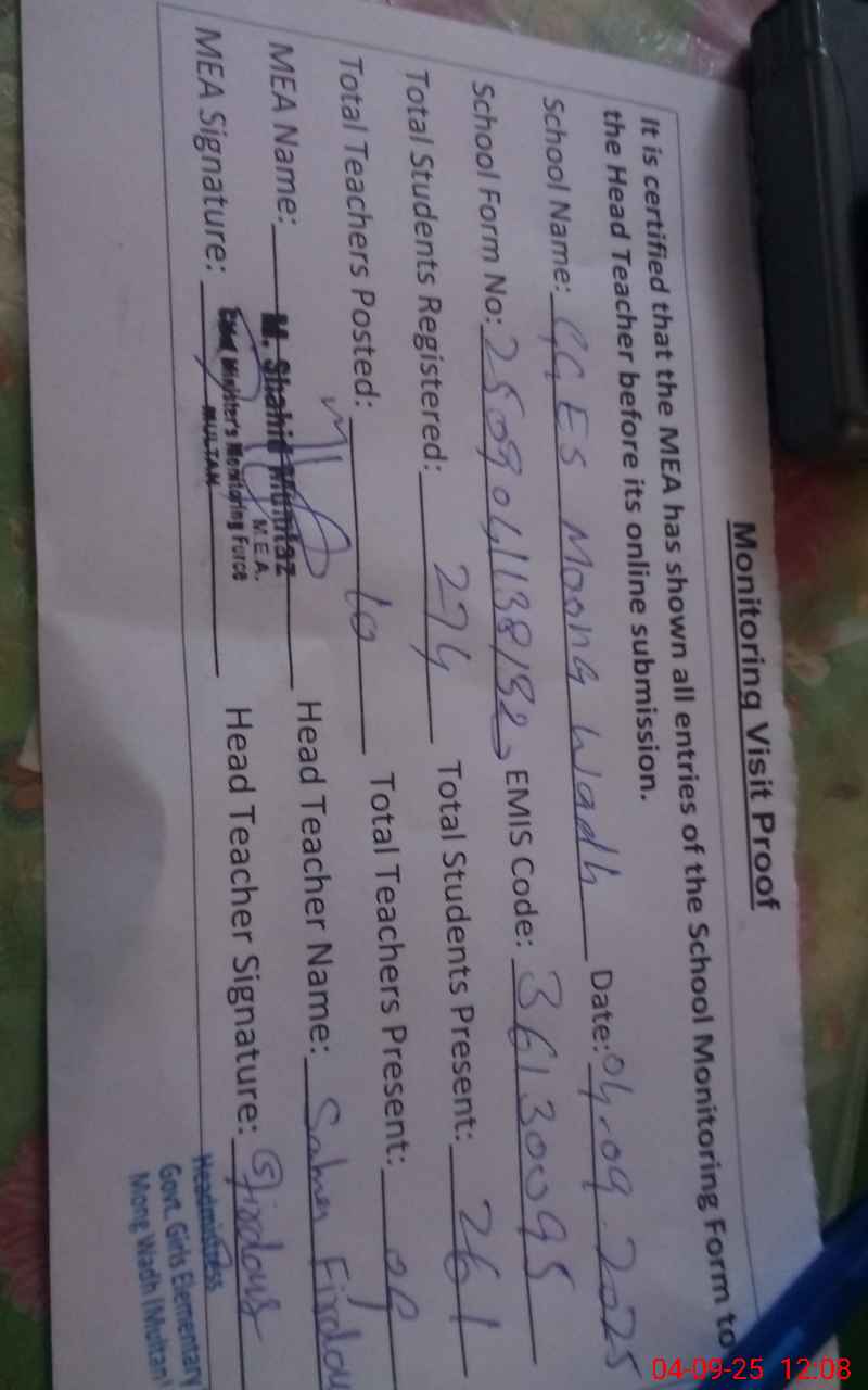 | Attendance Register | Head Teacher | MEA with School | Visit Proof |