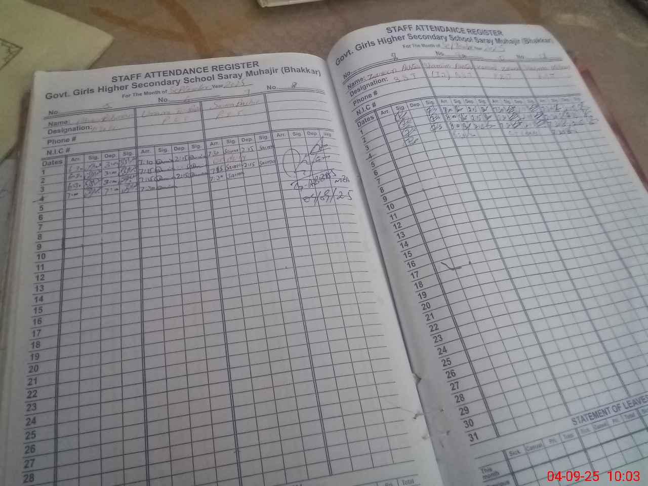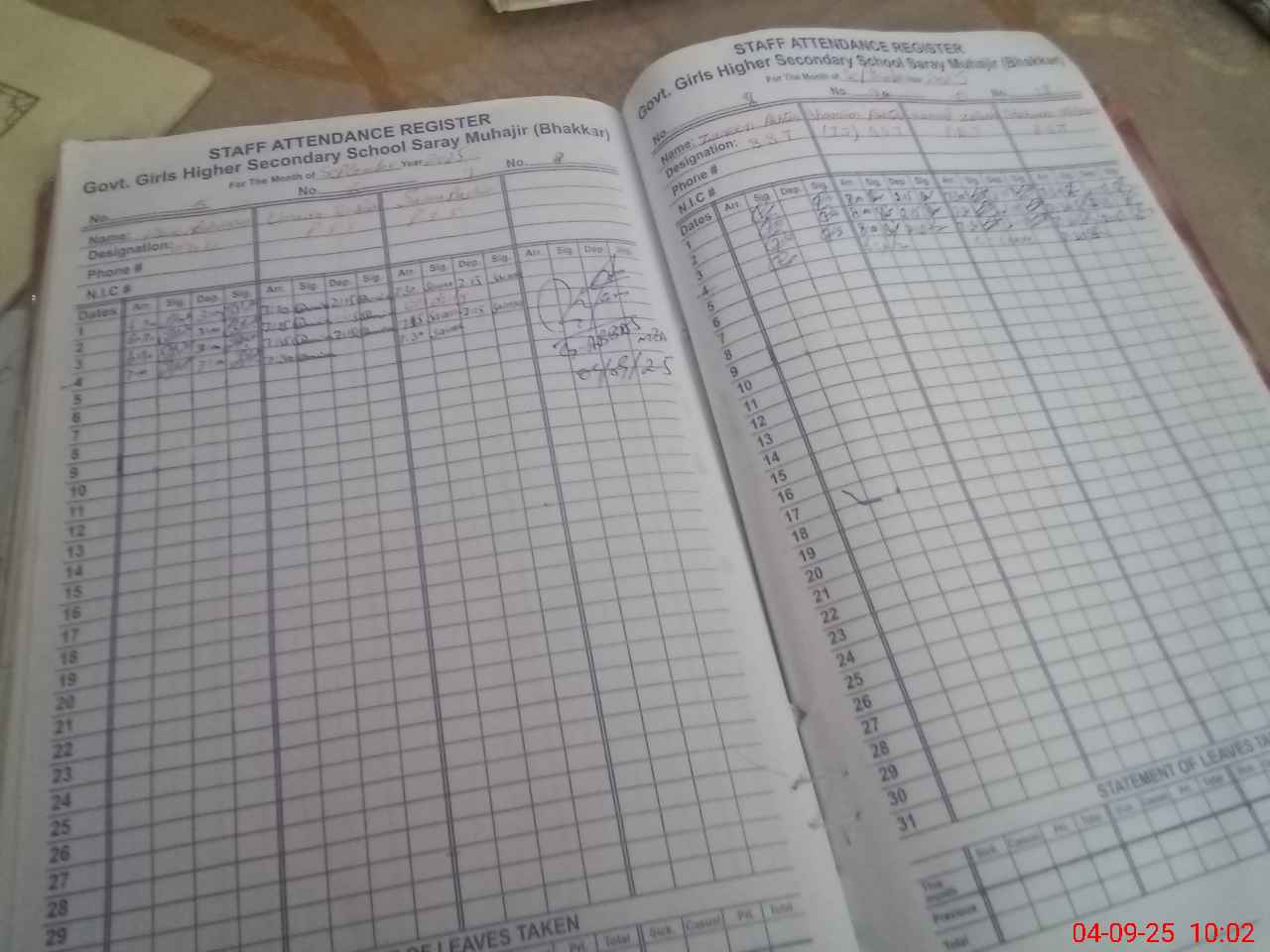 | CNIC | Full Name | Designation | R/C | Absence During Last Calender Month |