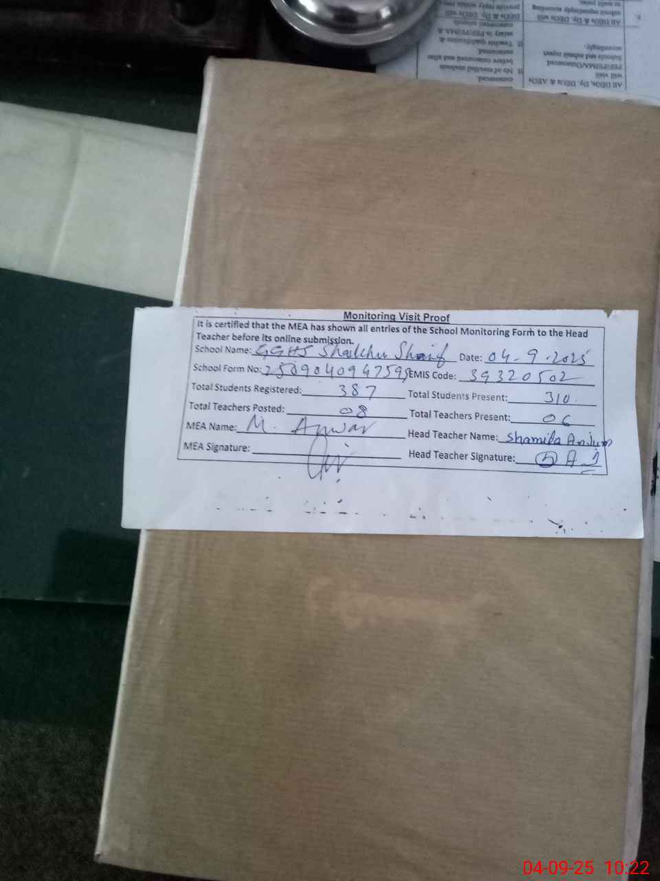 | Attendance Register | Head Teacher | MEA with School | Visit Proof |