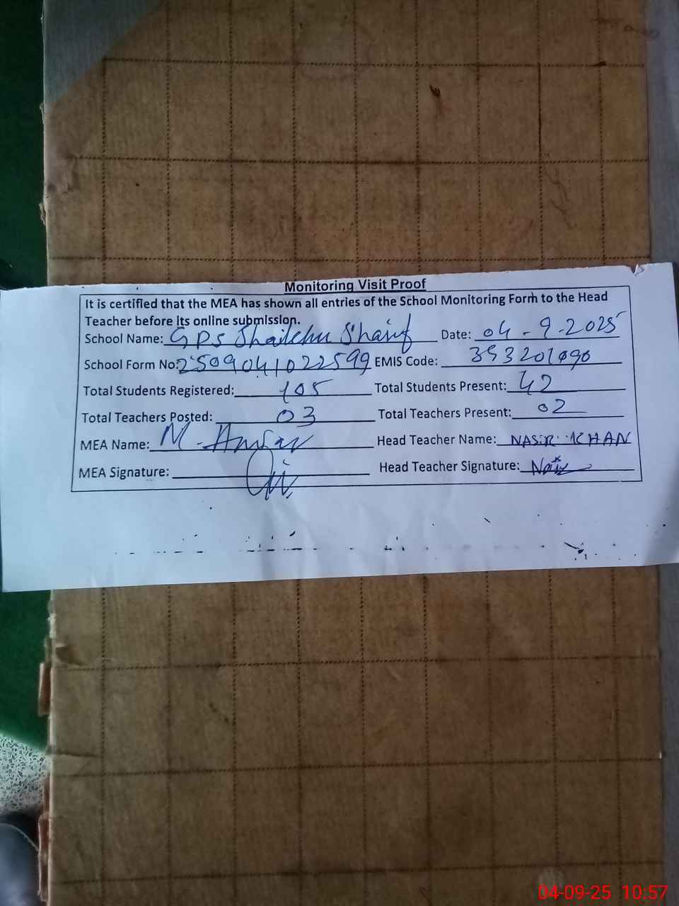 | Attendance Register | Head Teacher | MEA with School | Visit Proof |