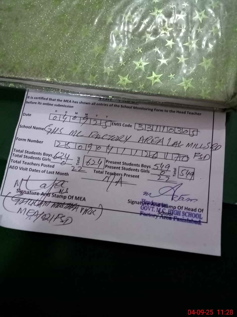 | EMIS Code: 33110305 | Name of School: GHS MC FACTORY AREA LAL MILLS ROAD FSD | |||