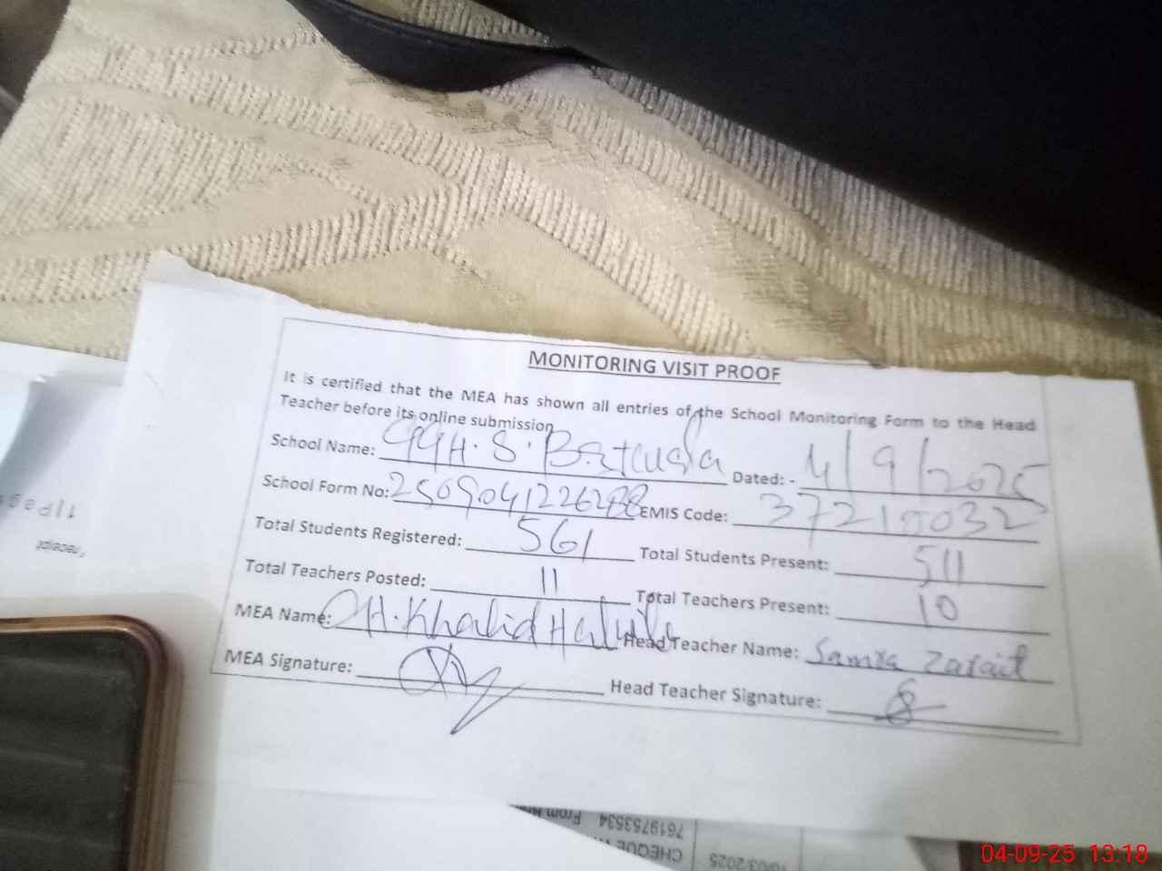 | Attendance Register | Head Teacher | MEA with School | Visit Proof |