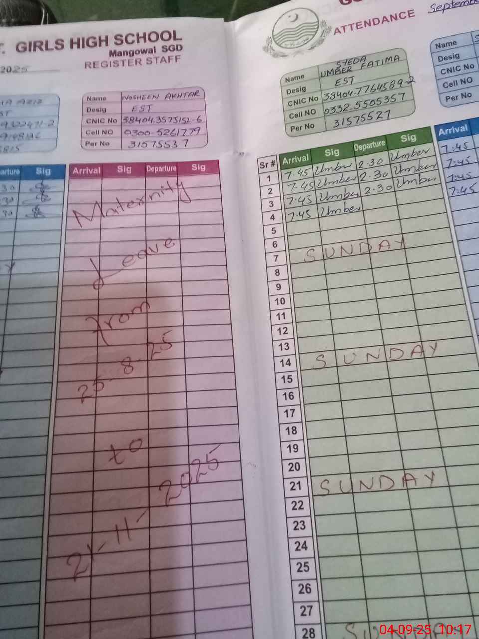 | CNIC | Full Name | Designation | R/C | Absence During Last Calender Month |