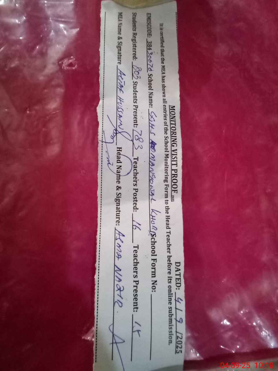 | Certified that this School was Inspected by the Undersigned MEA/DMO Today and the Information Stated Above is as Per Record. | |||||