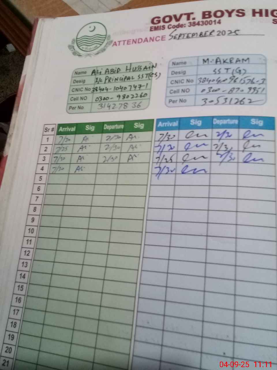 | Name: Al**** Ab**** Hu**** Sh**** Designation: (School Headmaster's/Headmistress's) I/C HEADMASTER Phone/Cell Number: 03**** |