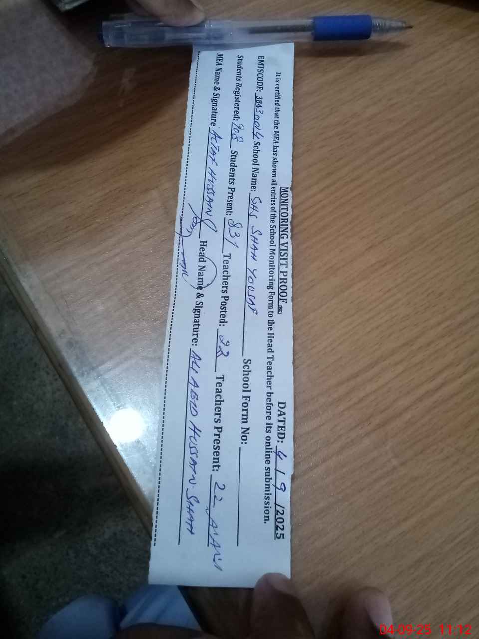 | Attendance Register | Head Teacher | MEA with School | Visit Proof |