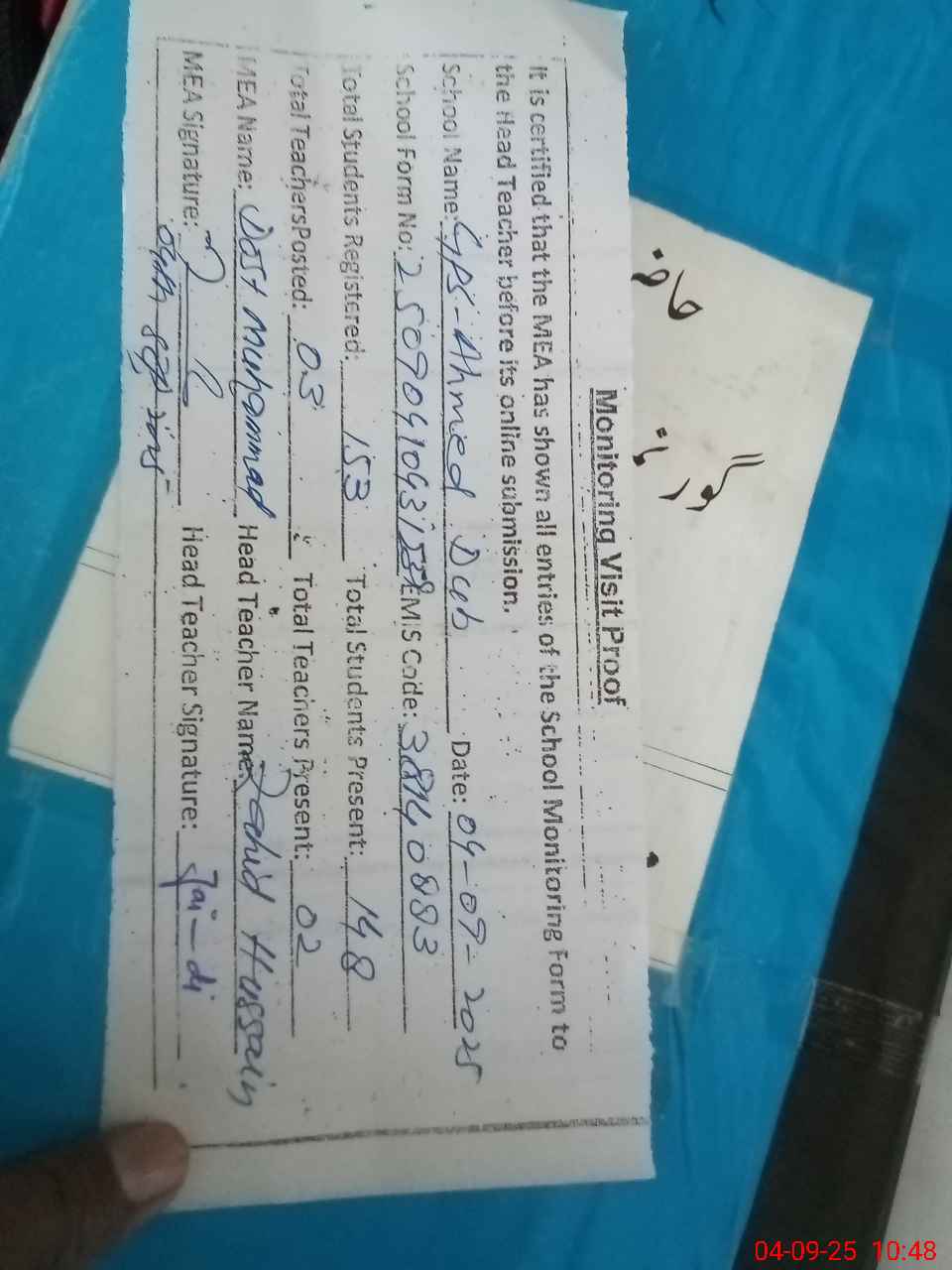 | Attendance Register | Head Teacher | MEA with School | Visit Proof |