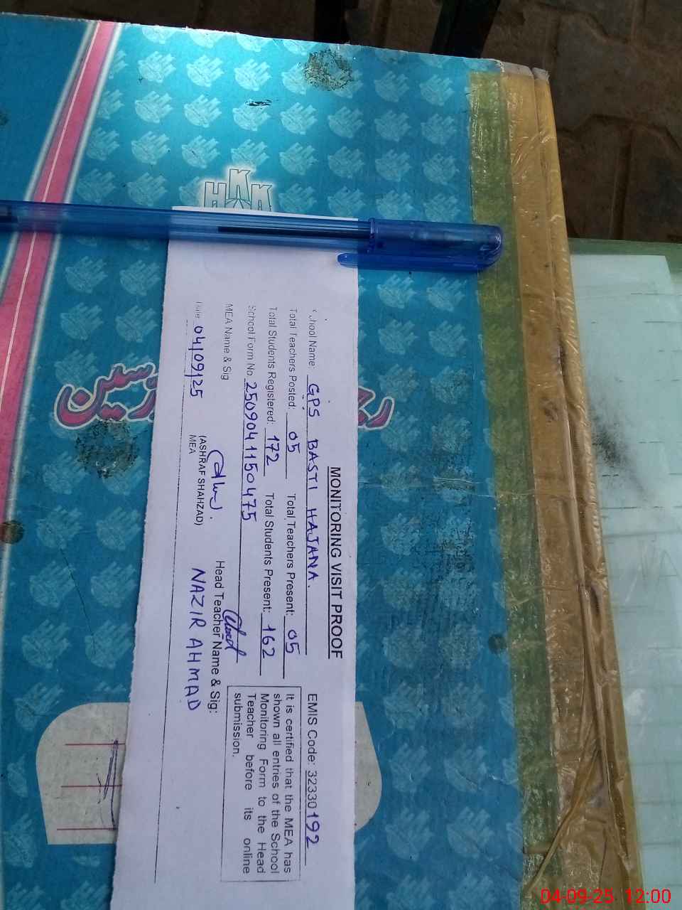 | Attendance Register | Head Teacher | MEA with School | Visit Proof |