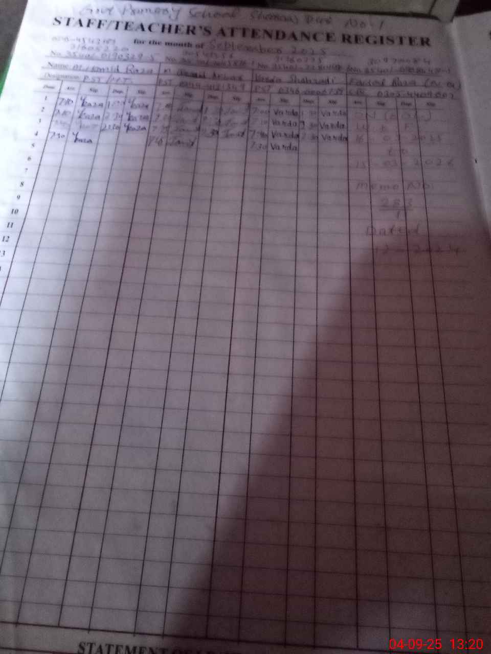 | CNIC | Full Name | Designation | R/C | Absence During Last Calender Month |