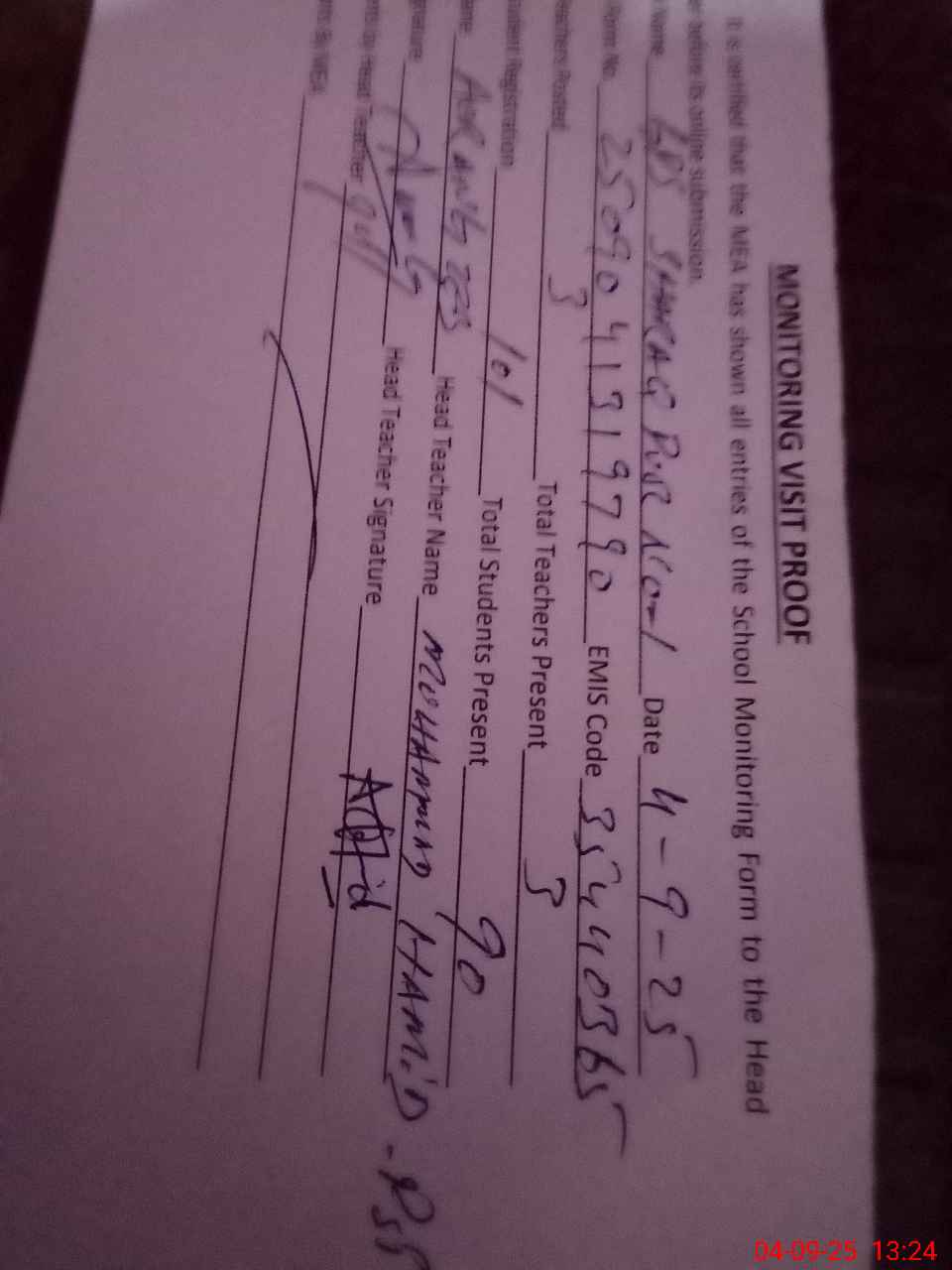 | Attendance Register | Head Teacher | MEA with School | Visit Proof |