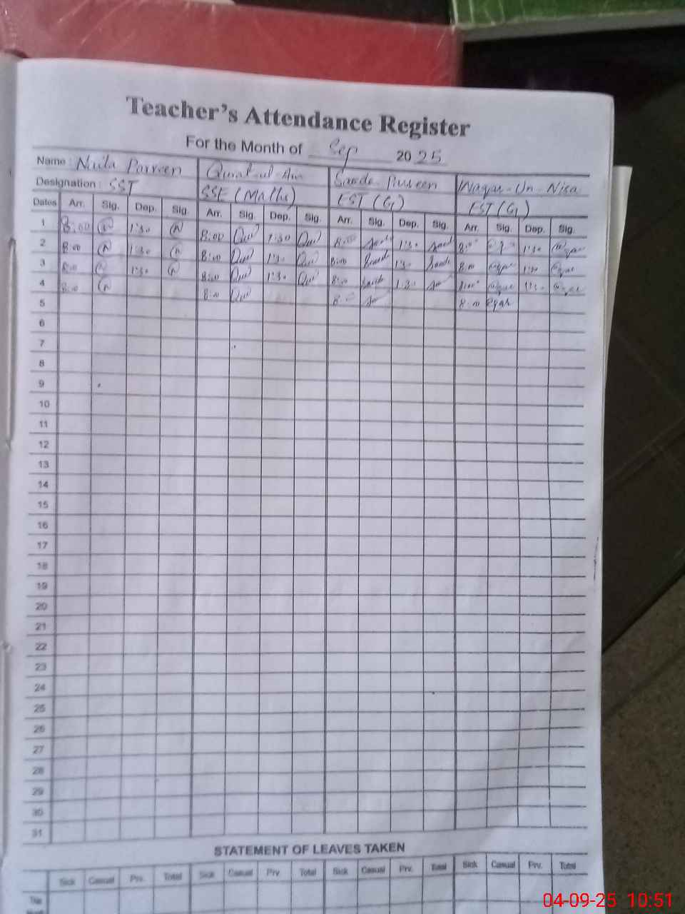 | Leave | Duty | Absent | Maternity | Medical | Ex- Pak |