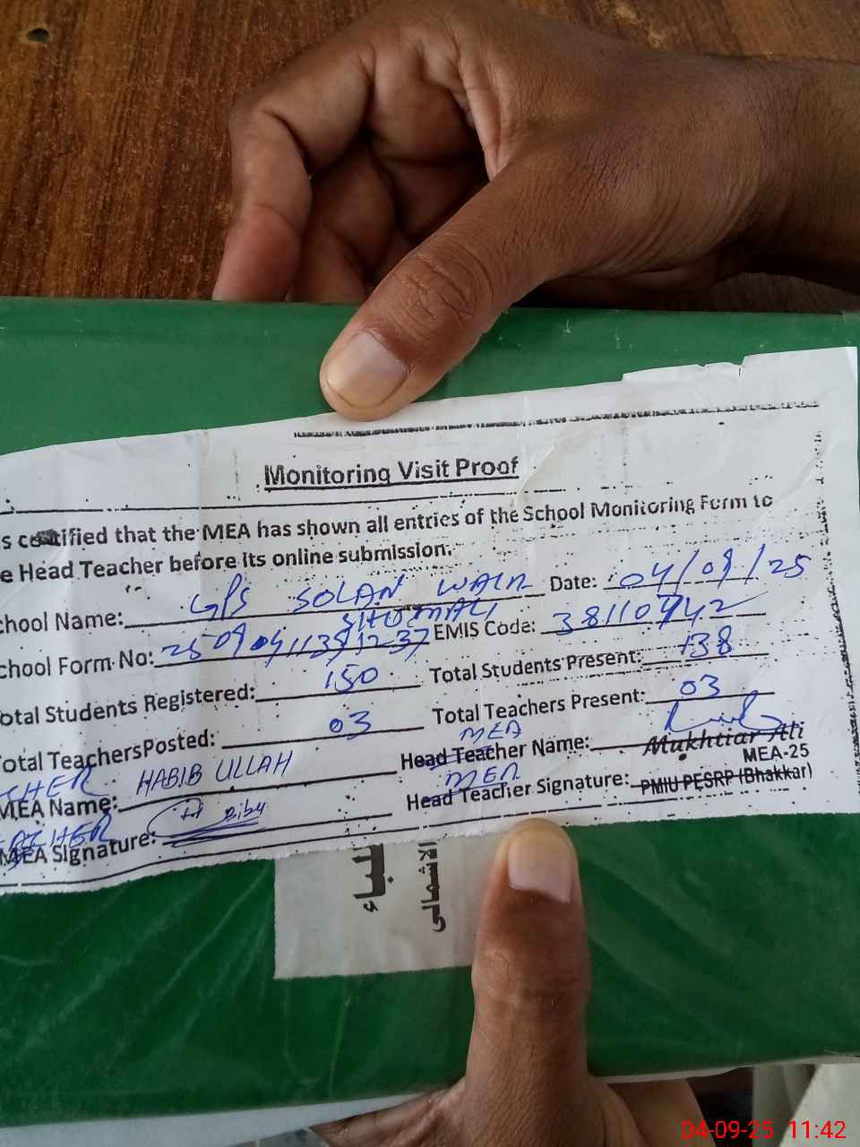 | Attendance Register | Head Teacher | MEA with School | Visit Proof |