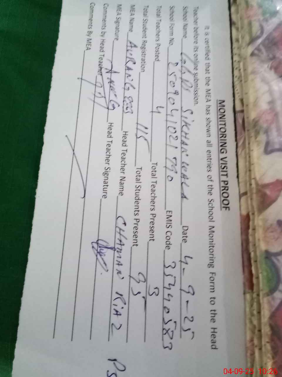 | Attendance Register | Head Teacher | MEA with School | Visit Proof |