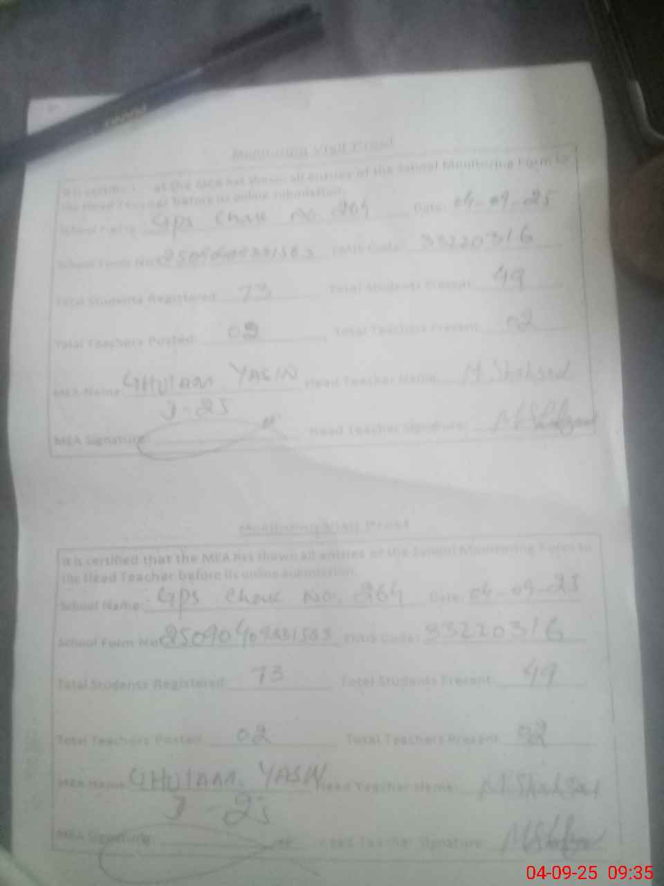 | Attendance Register | Head Teacher | MEA with School | Visit Proof |