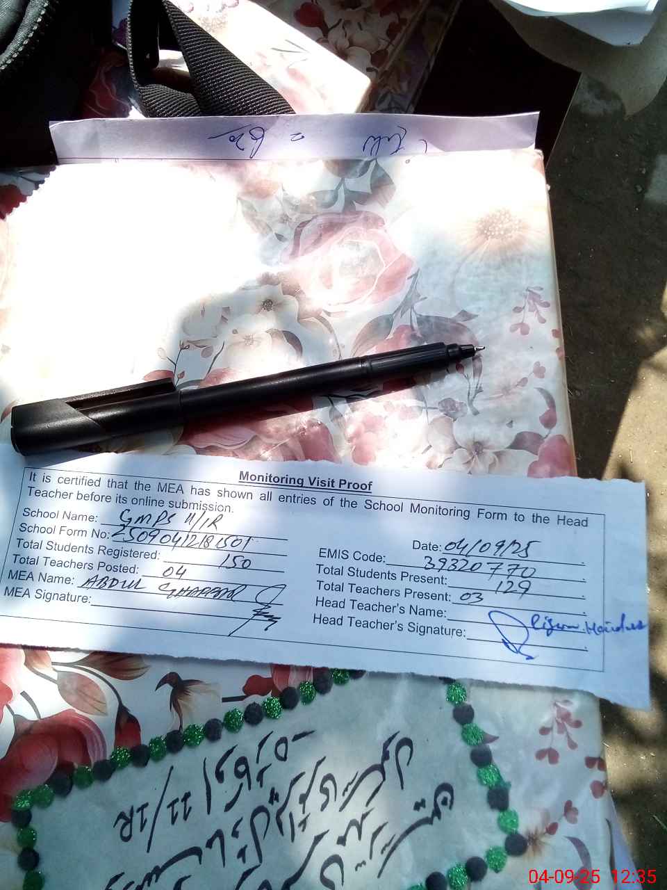 | Attendance Register | Head Teacher | MEA with School | Visit Proof |