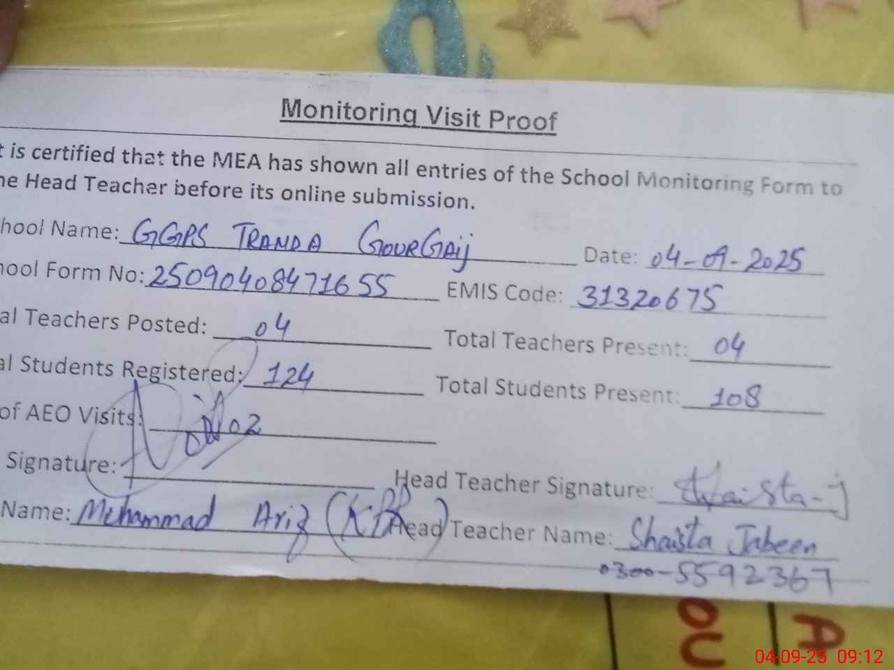 | Attendance Register | Head Teacher | MEA with School | Visit Proof |