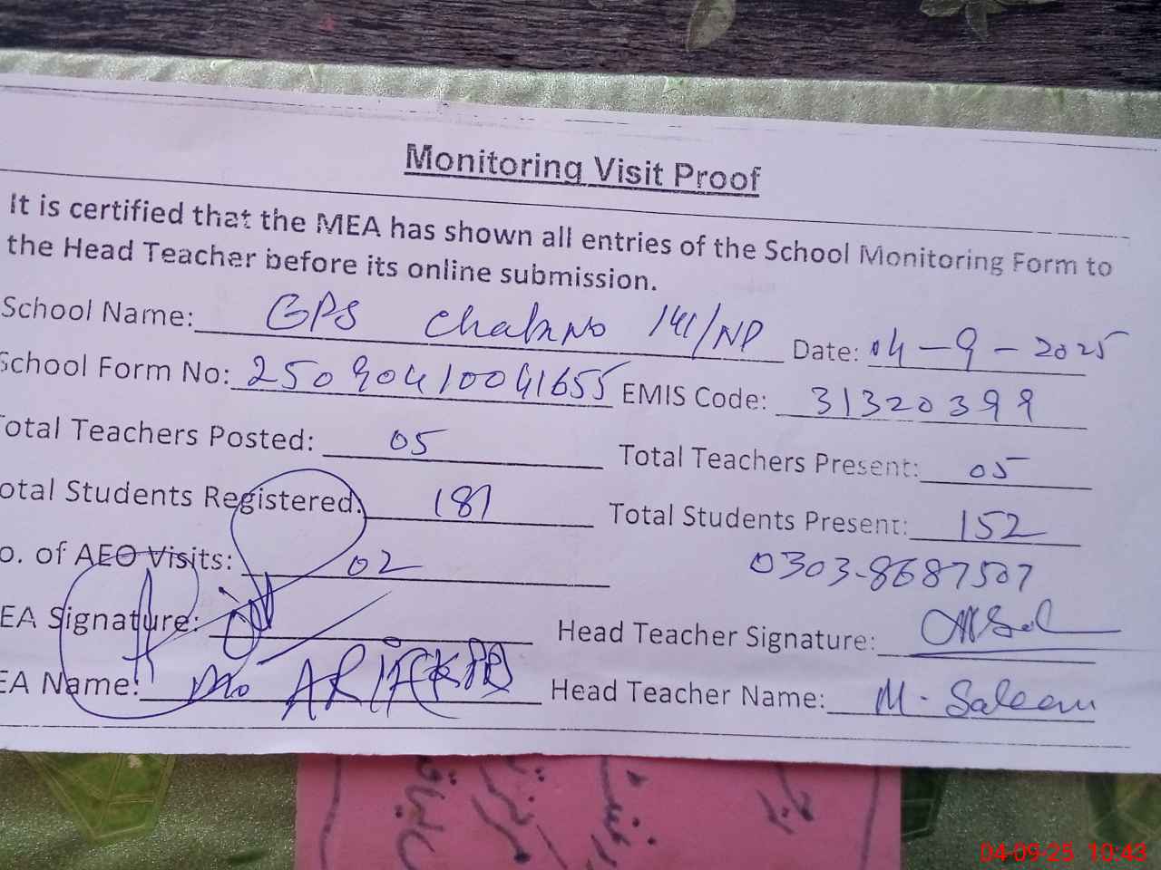 | EMIS Code: 31320399 | Name of School: GPS CHAK 141 NP | |||
