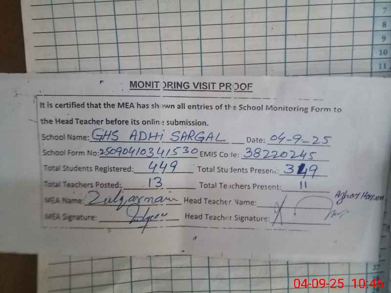 | EMIS Code: 38220245 | Name of School: GHS ADHI SARGAL | |||