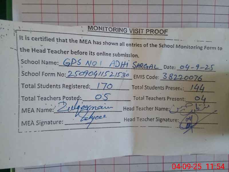 | EMIS Code: 38220076 | Name of School: GPS NO. 1 ADHI SARGAL | |||