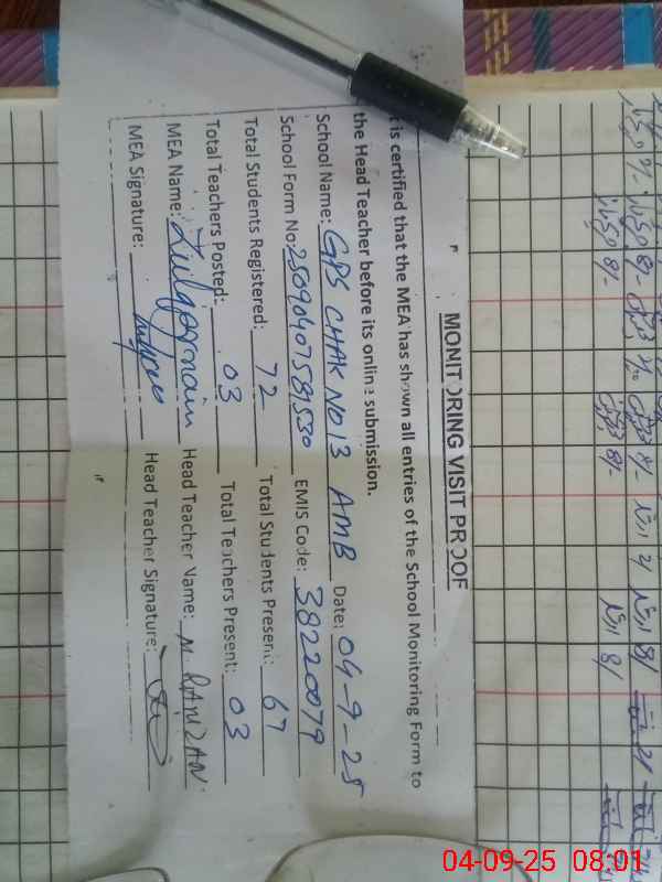 | EMIS Code: 38220079 | Name of School: GPS CHAK NO. 13-A/MB | |||