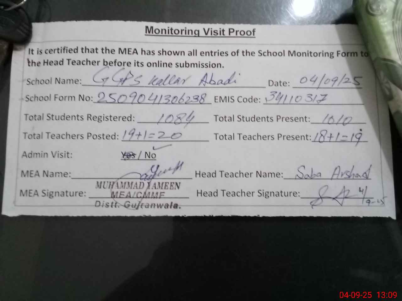 | Attendance Register | Head Teacher | MEA with School | Visit Proof |