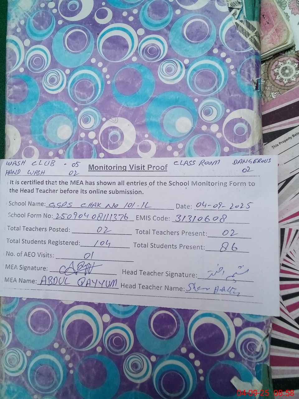 | EMIS Code: 31310608 | Name of School: GGPS CHAK NO 101/1-L | |||