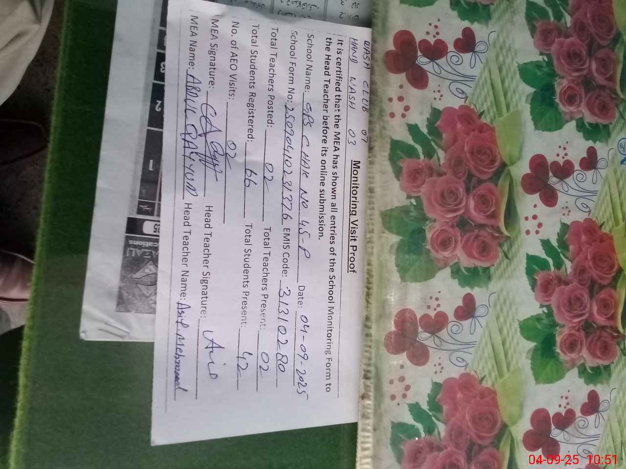 | Attendance Register | Head Teacher | MEA with School | Visit Proof |