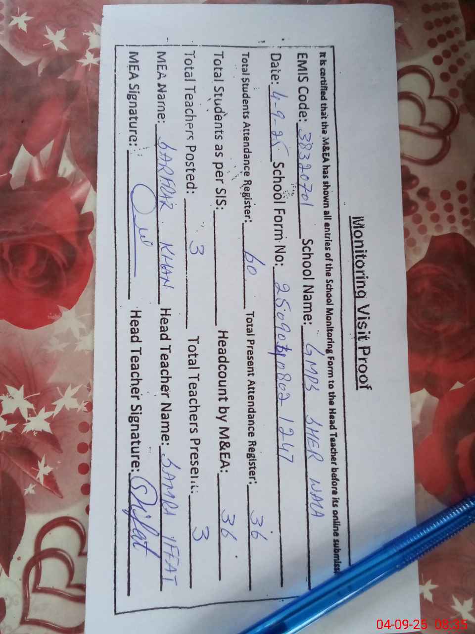 | EMIS Code: 38320701 | Name of School: GMPS SHER WALA | |||