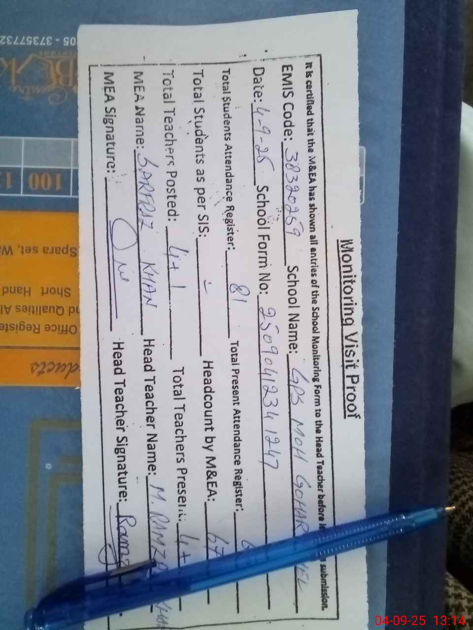 | Attendance Register | Head Teacher | MEA with School | Visit Proof |