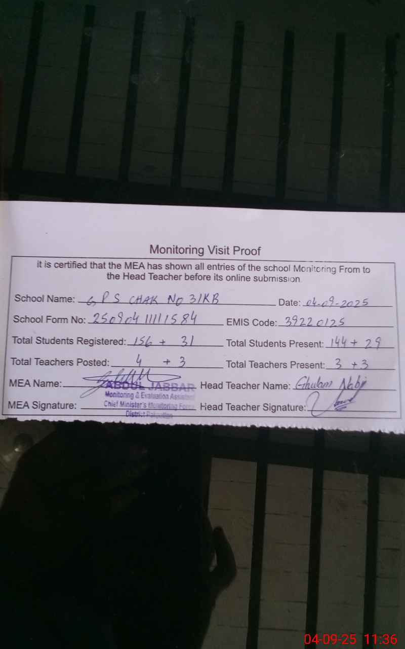 | EMIS Code: 39220125 | Name of School: GPS CHAK NO. 31 KB | |||
