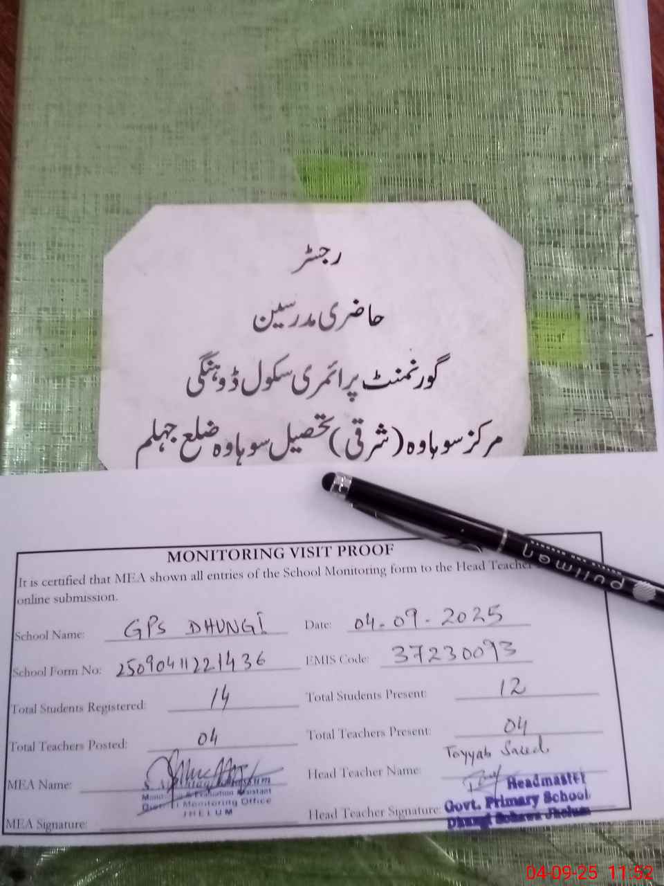 | Attendance Register | Head Teacher | MEA with School | Visit Proof |