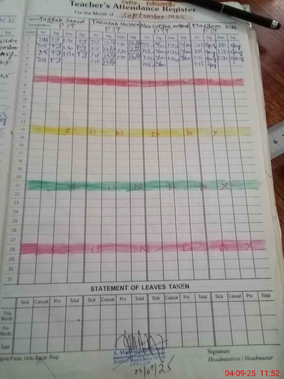 | CNIC | Full Name | Designation | R/C | Absence During Last Calender Month |