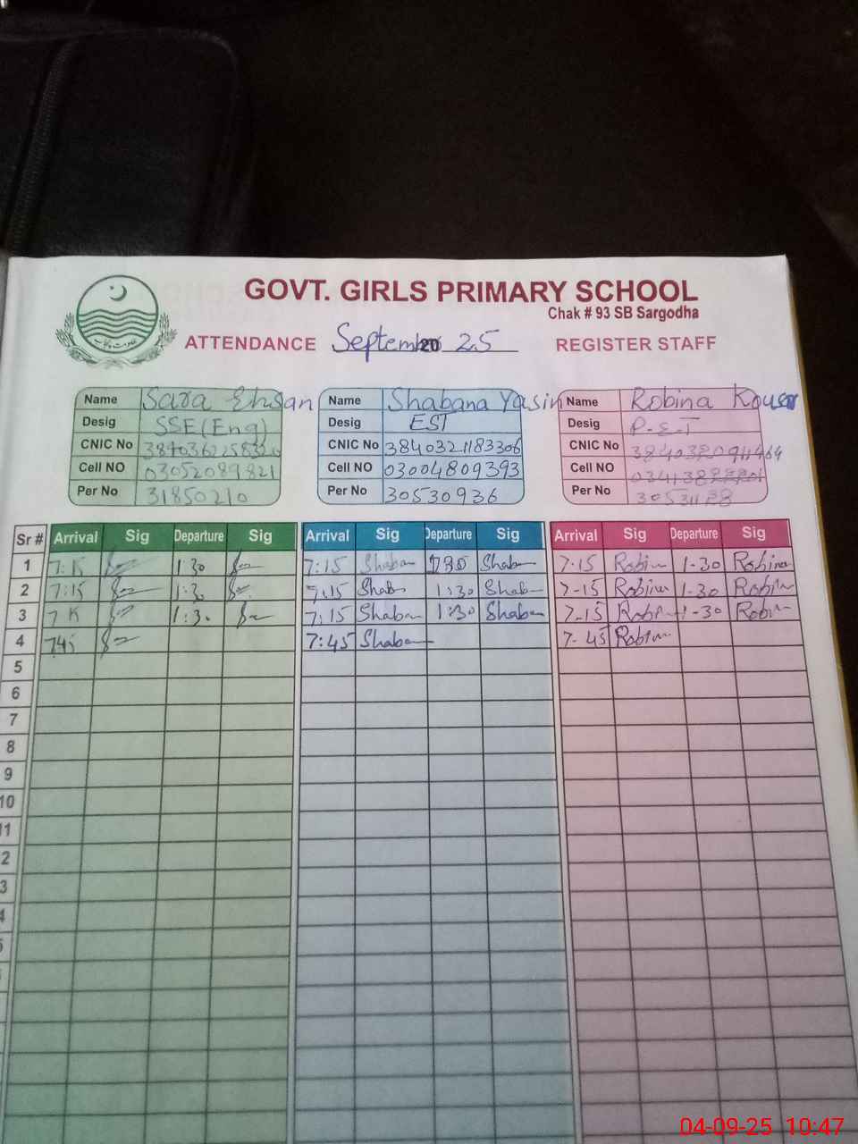 | CNIC | Full Name | Designation | R/C | Absence During Last Calender Month |