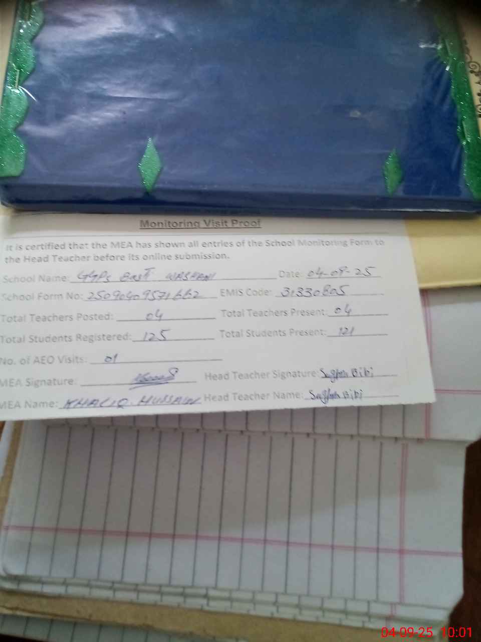 | Attendance Register | Head Teacher | MEA with School | Visit Proof |