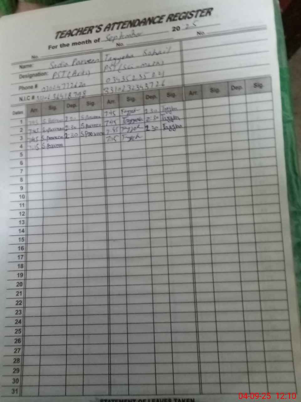 | Name: SA**** PA**** Designation: (School Headmaster's/Headmistress's) PST Phone/Cell Number: 03**** |