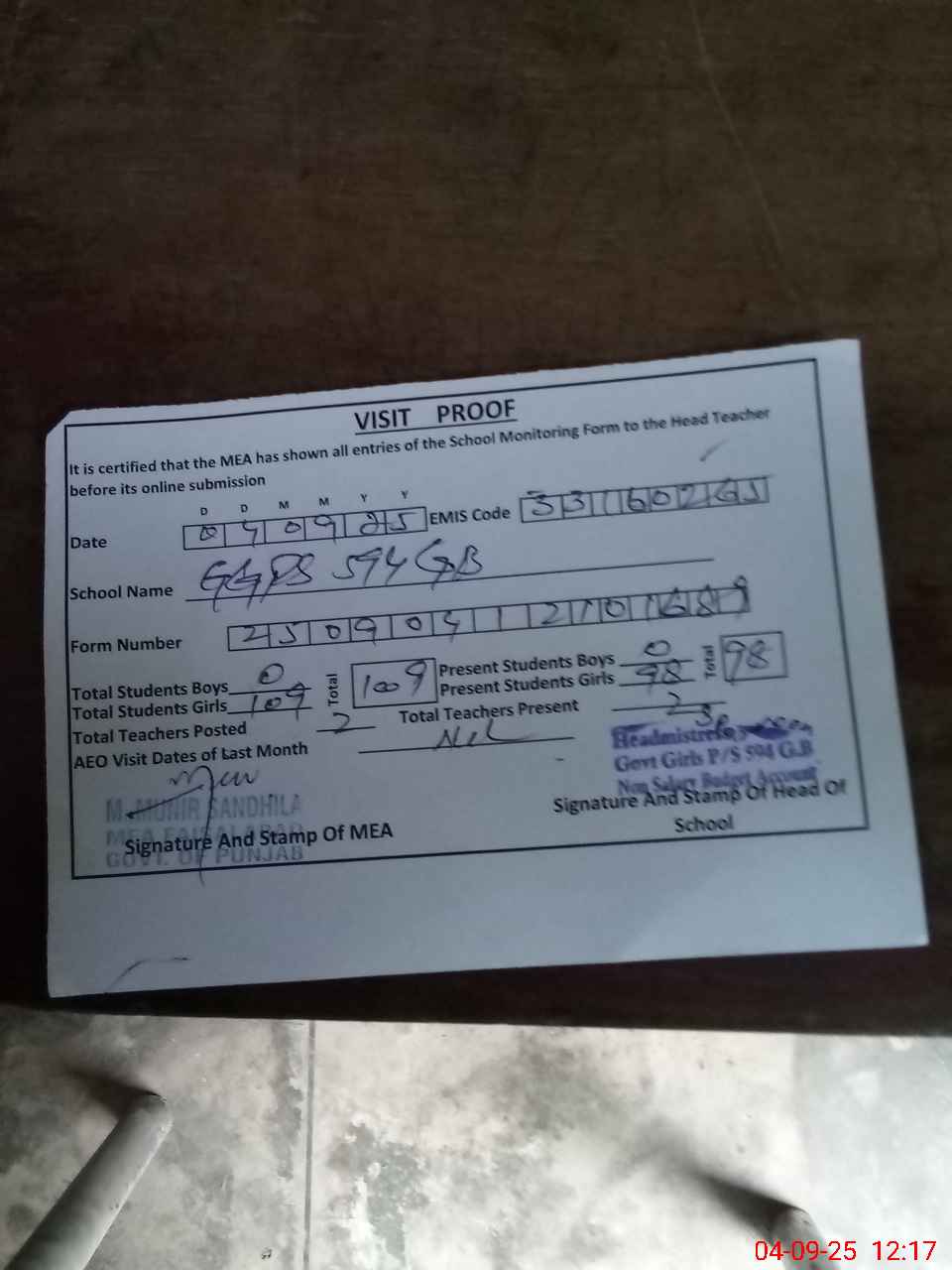 | EMIS Code: 33160265 | Name of School: GGPS 594 GB | |||