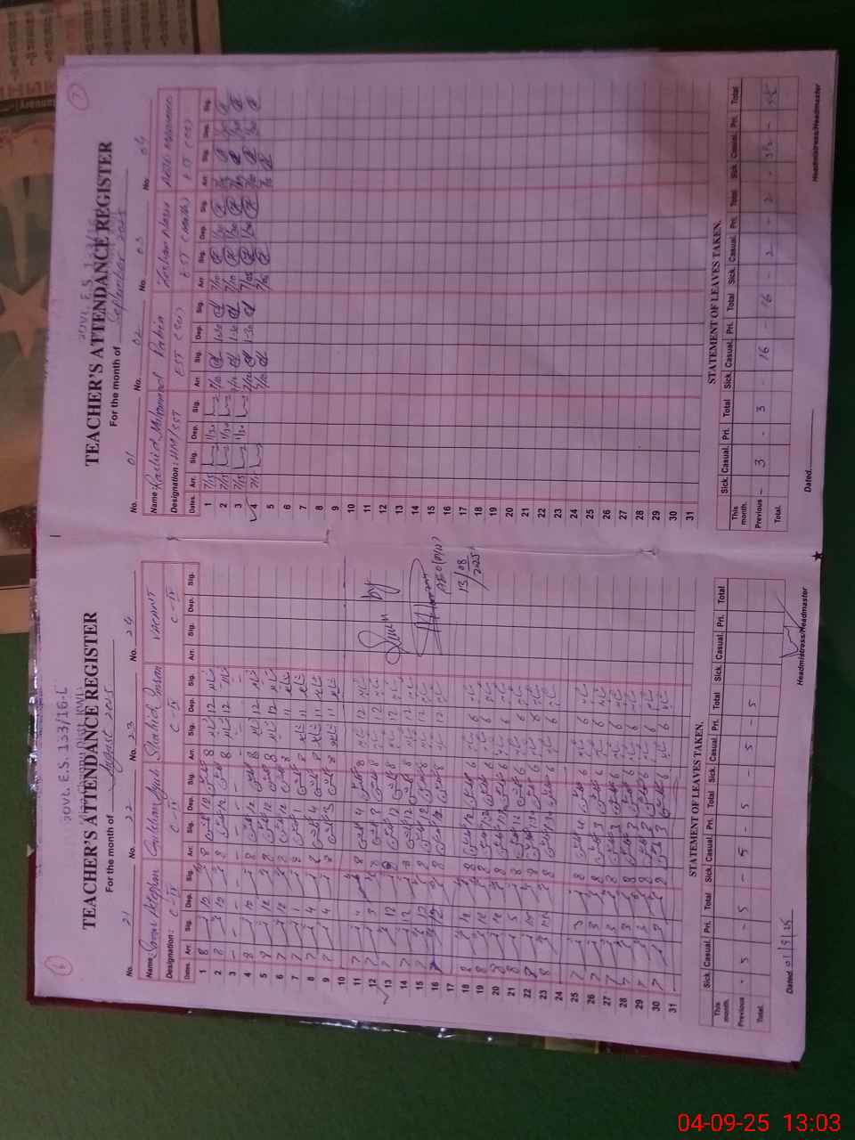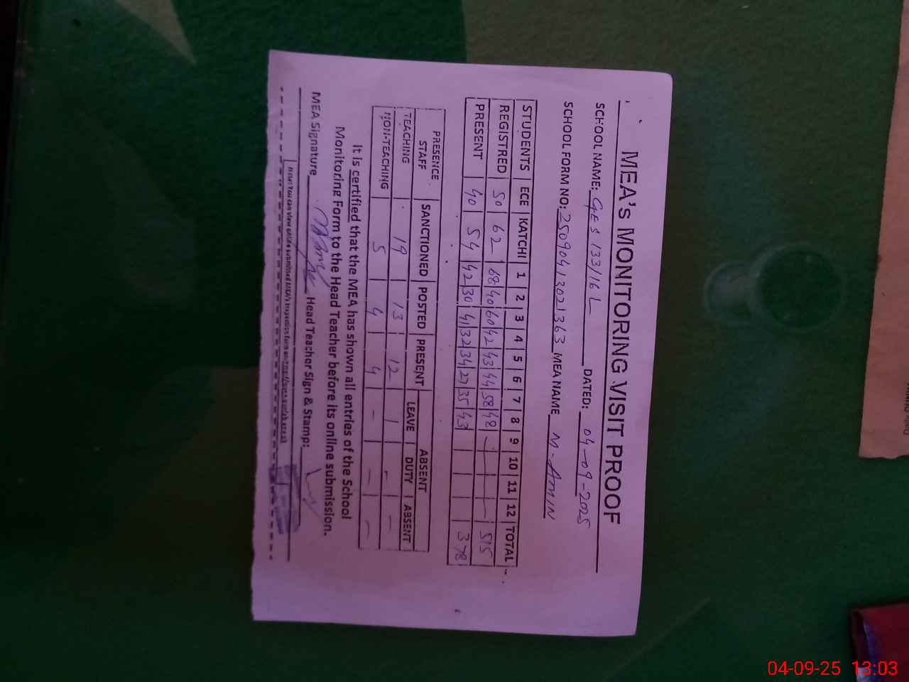 | Attendance Register | Head Teacher | MEA with School | Visit Proof |