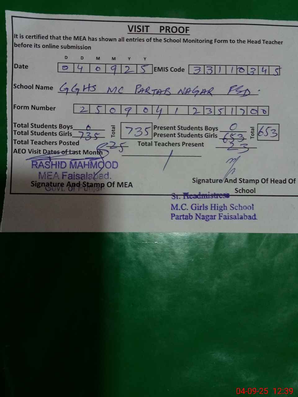 | EMIS Code: 33110345 | Name of School: GGHS MC PARTAB NAGAR FAISALABAD | |||