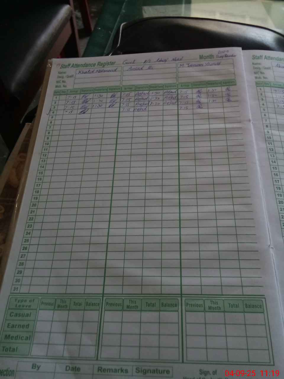 | CNIC | Full Name | Designation | R/C | Absence During Last Calender Month |