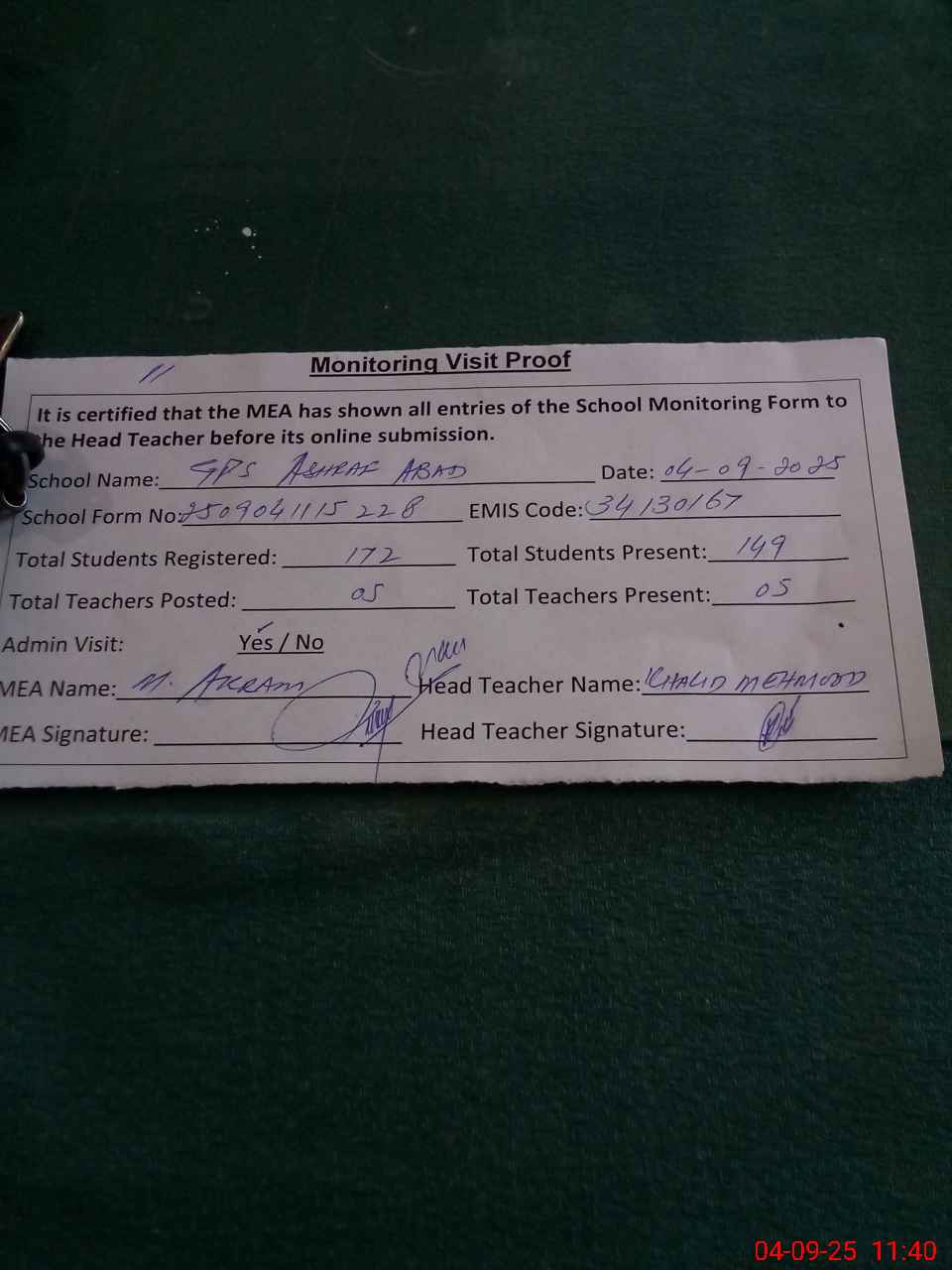| Attendance Register | Head Teacher | MEA with School | Visit Proof |