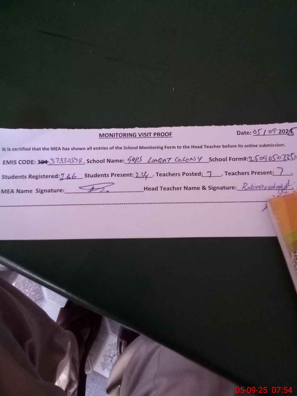 | Attendance Register | Head Teacher | MEA with School | Visit Proof |