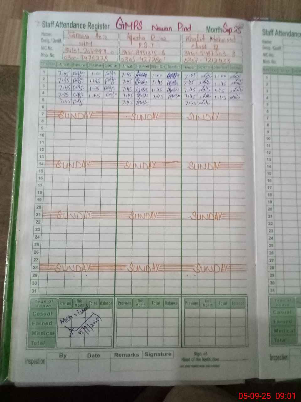 | CNIC | Full Name | Designation | R/C | Absence During Last Calender Month |