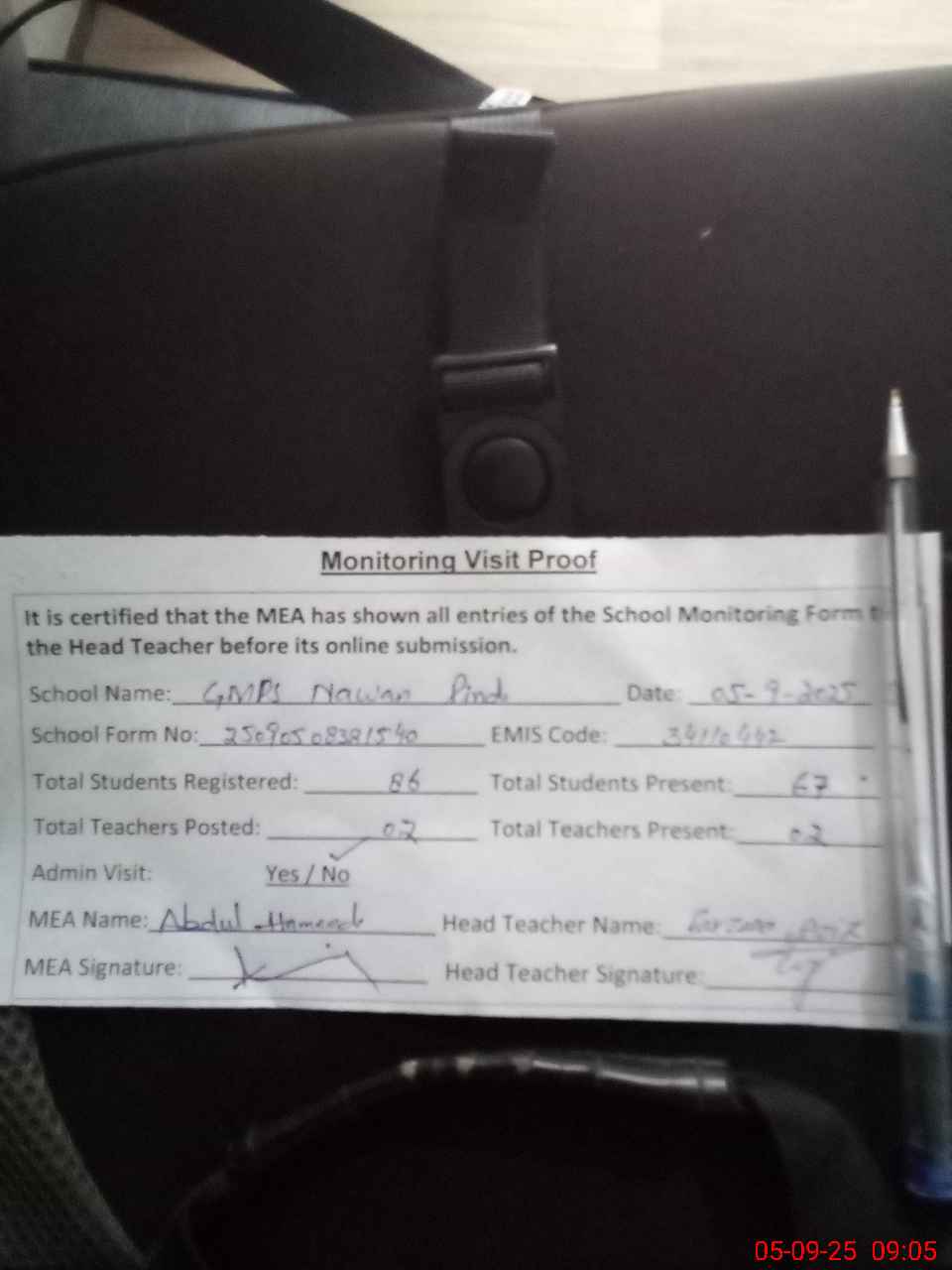 | Attendance Register | Head Teacher | MEA with School | Visit Proof |