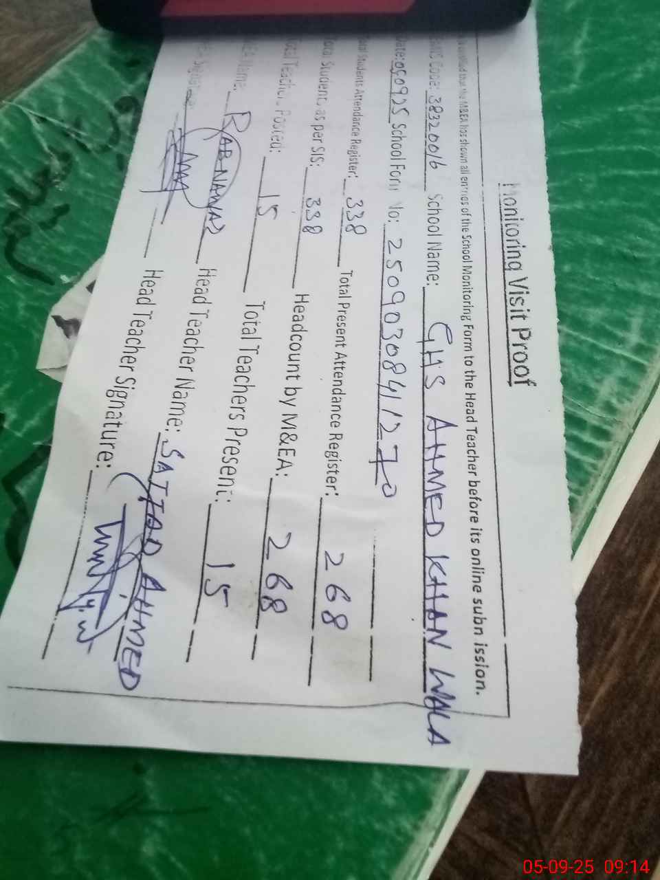 | Attendance Register | Head Teacher | MEA with School | Visit Proof |