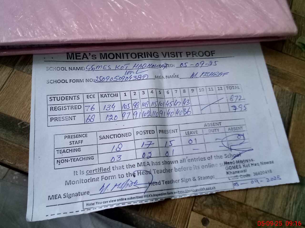 | Attendance Register | Head Teacher | MEA with School | Visit Proof |