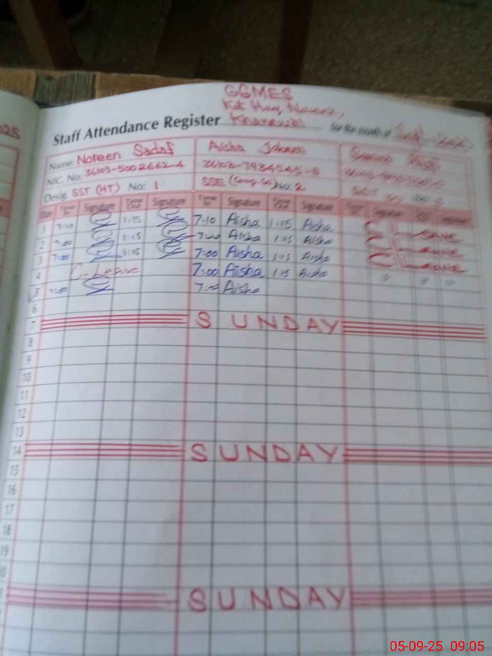 | CNIC | Full Name | Designation | R/C | Absence During Last Calender Month |