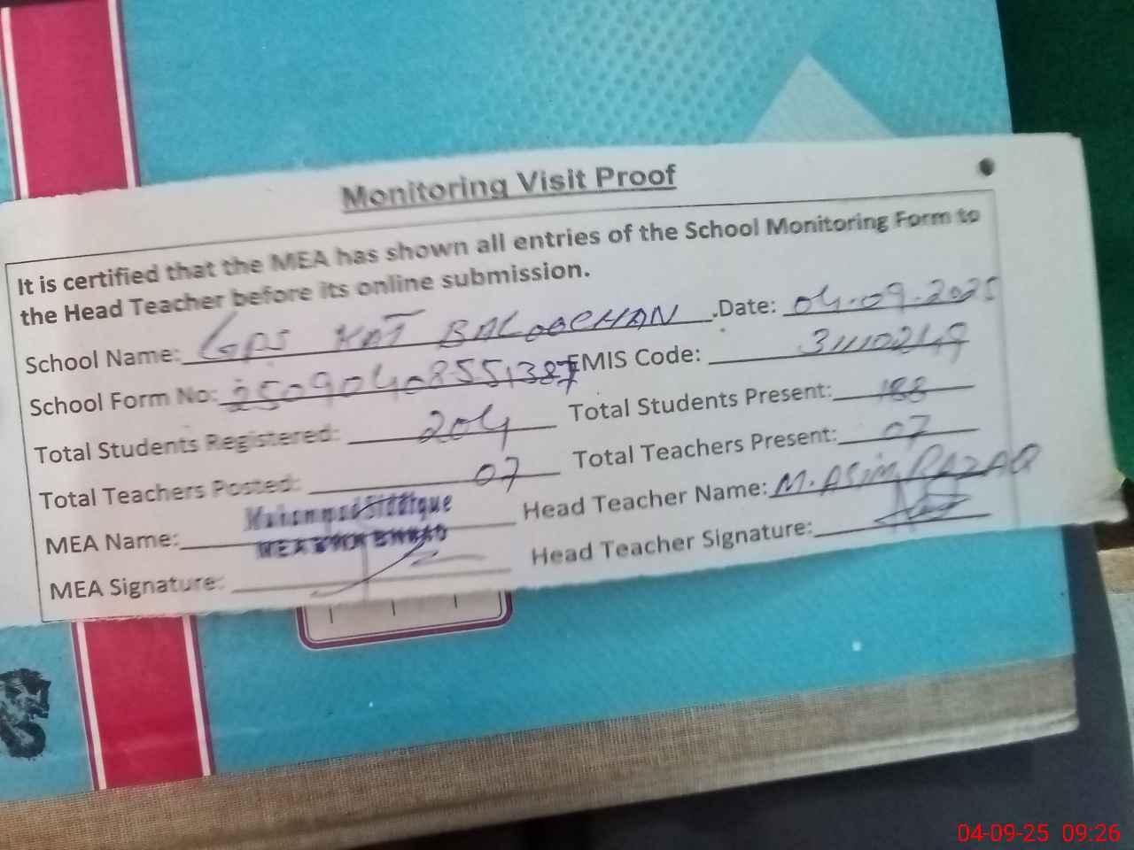 | Attendance Register | Head Teacher | MEA with School | Visit Proof |