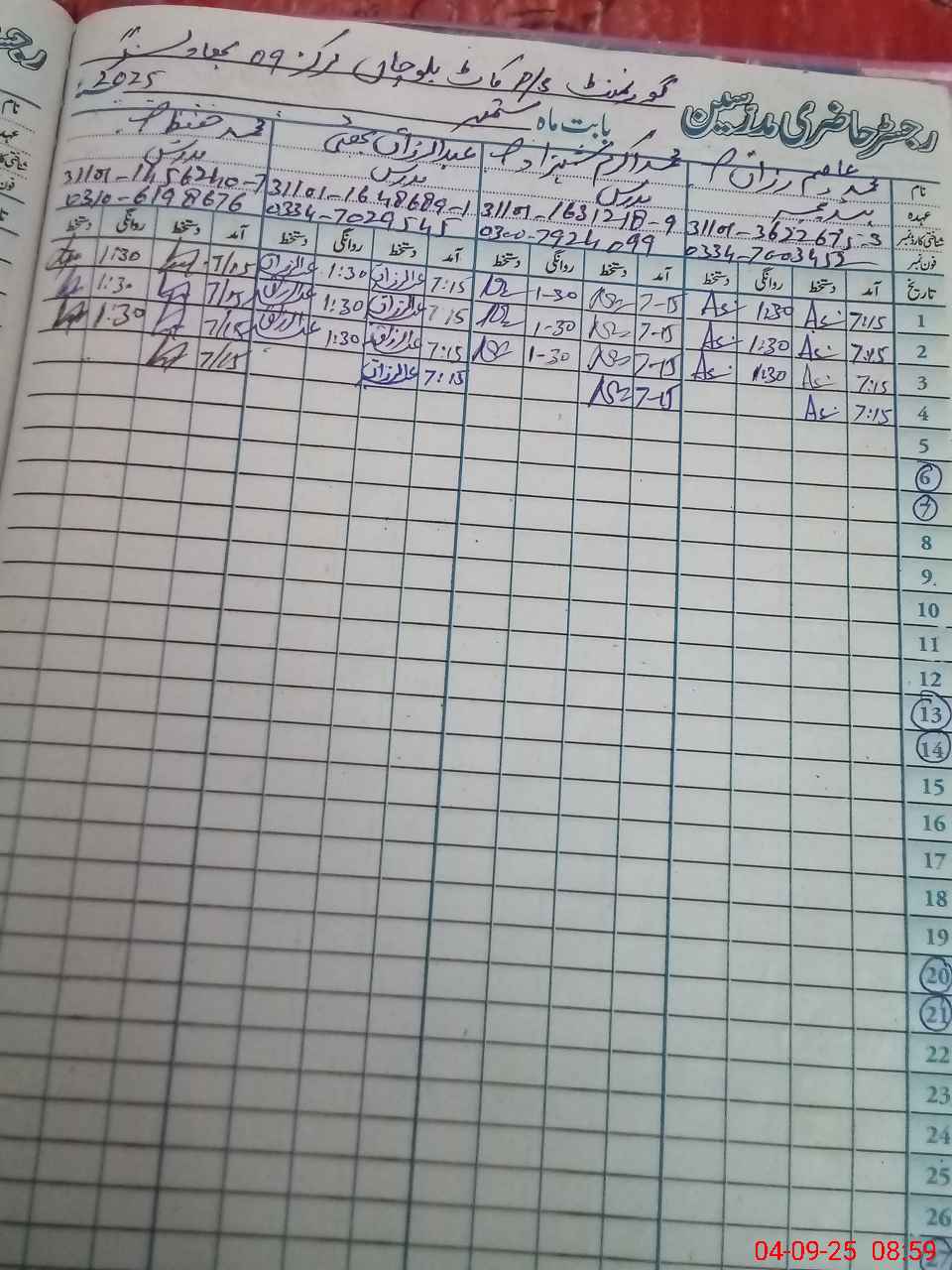 | CNIC | Full Name | Designation | R/C | Absence during last cal. month |
