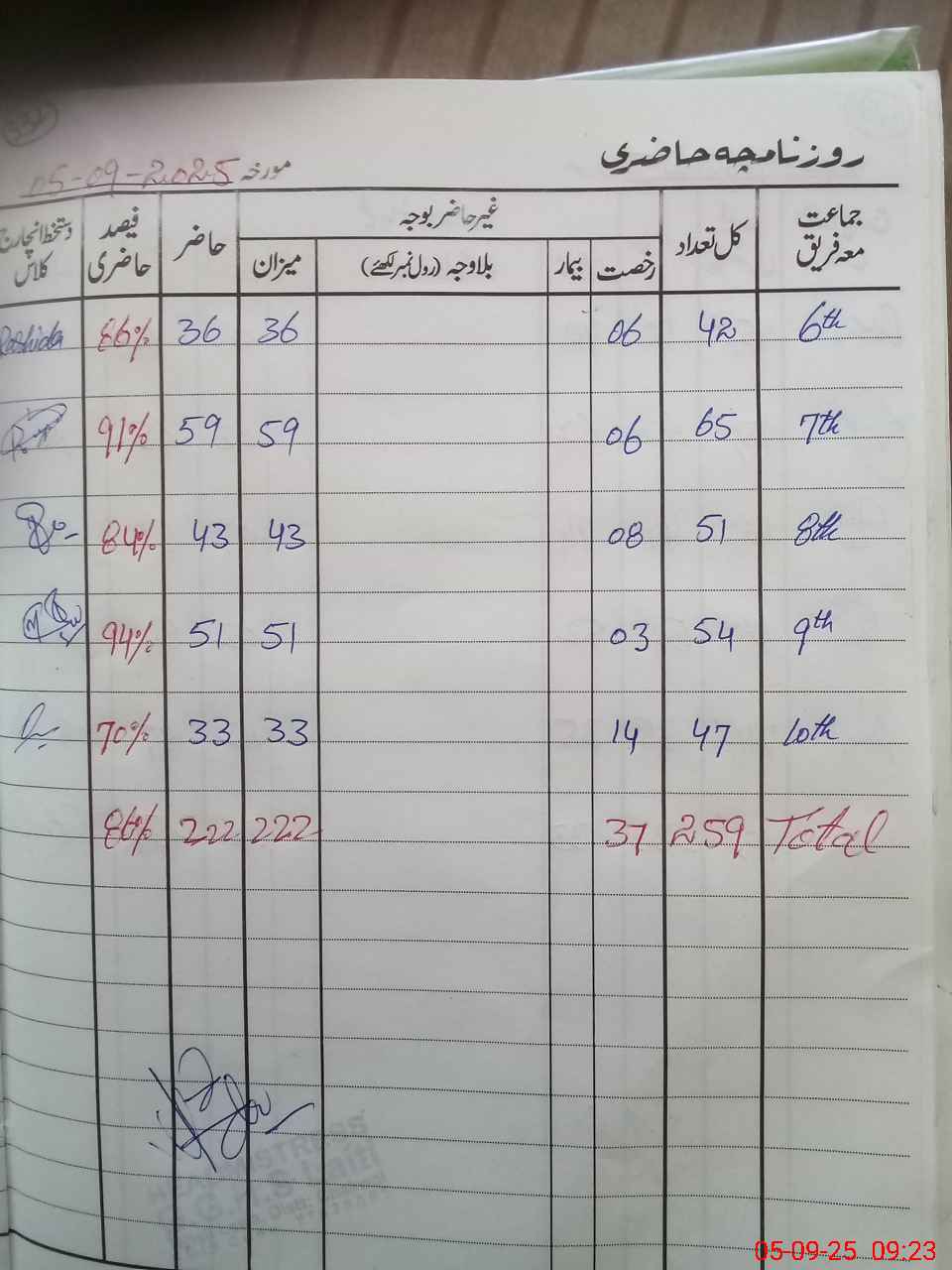 | Total Students Present | 0 | 0 | 0 | 0 | 0 | 0 | 0 | 0 | 36 | 59 | 43 | 51 | 33 | 222 | ||